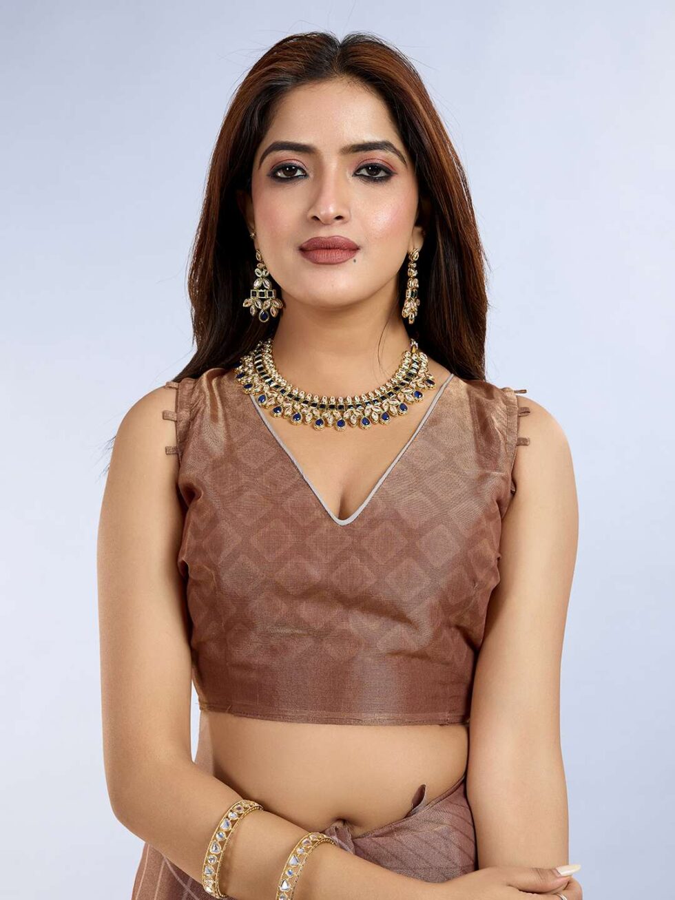 Embrace artistic elegance with this Abstract Printed Linen Shimmer Saree. This beautiful saree is crafted from a lightweight and luxurious linen shimmer fabric that offers a graceful drape and a subtle sheen. The warm earthy brown base is a perfect canvas for the striking abstract print, which features soft shapes and lines in hues of purple, lavender, pink, green, and blue. The modern and artistic design of the saree makes it a true statement piece.