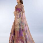 This unique linen shimmer saree in a warm earthy tone features a captivating abstract print in soft pastels. The blend of modern art and a traditional silhouette makes it a stylish and elegant choice for any special occasion.