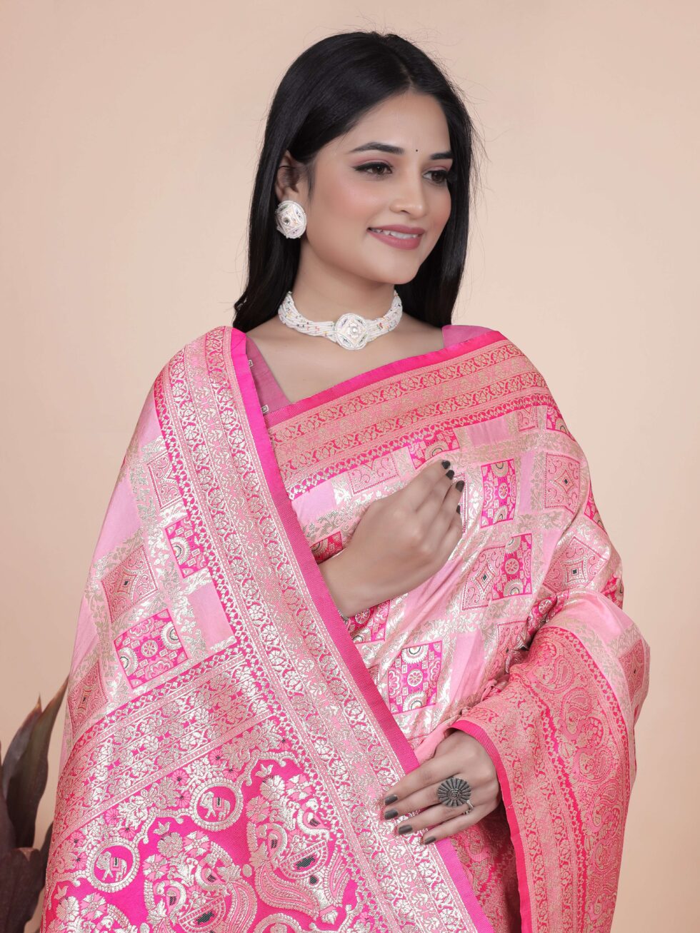 Celebrate elegance and tradition with this Baby Pink Banarasi Silk Saree with Rich Silver Zari Detailing. Crafted from premium silk, the soft pastel pink body is beautifully embellished with intricate geometric and floral motifs, woven in silver zari that radiates subtle grandeur.
