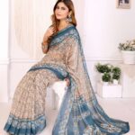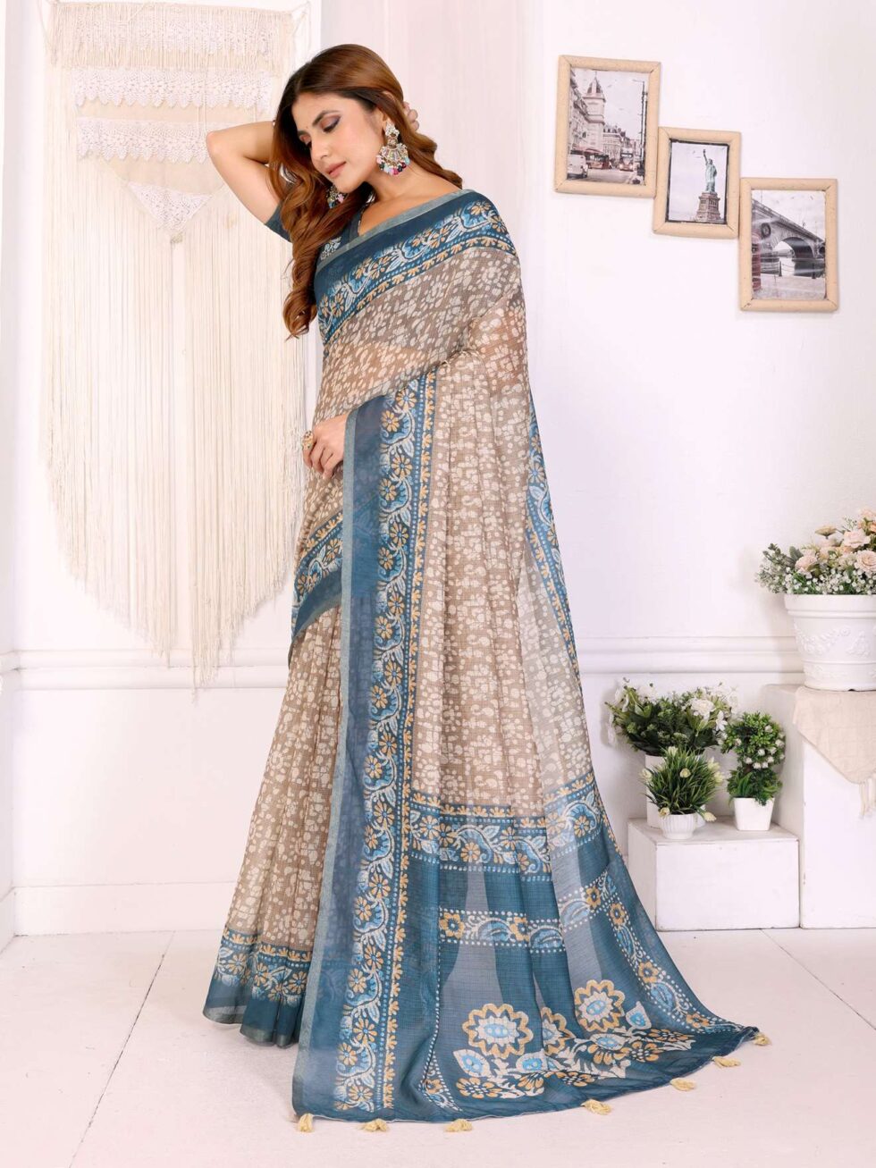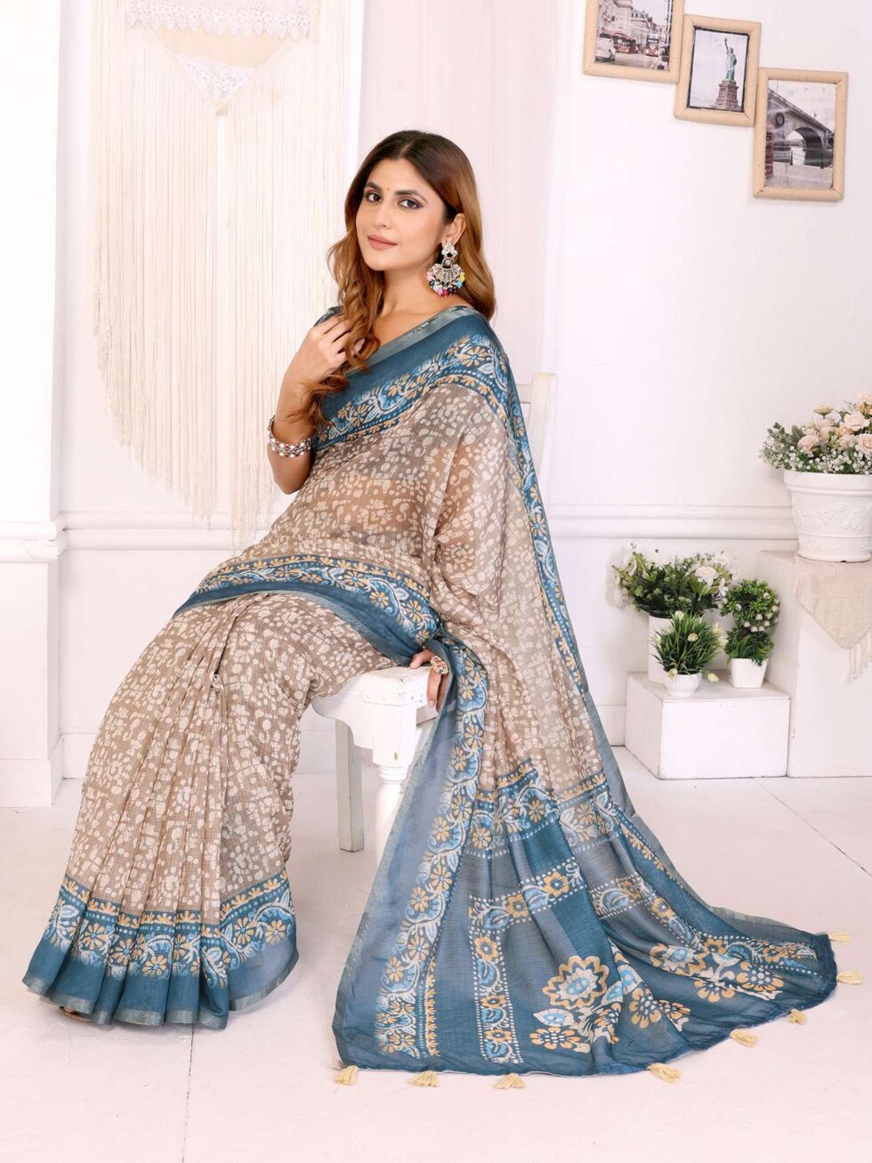 Add a touch of sophistication to your ethnic collection with the Beige & Teal Ethnic Motif Printed Chanderi Saree. Crafted from premium Chanderi fabric, this saree features a soft beige base adorned with intricate ethnic and floral digital prints, beautifully highlighted with teal blue borders.