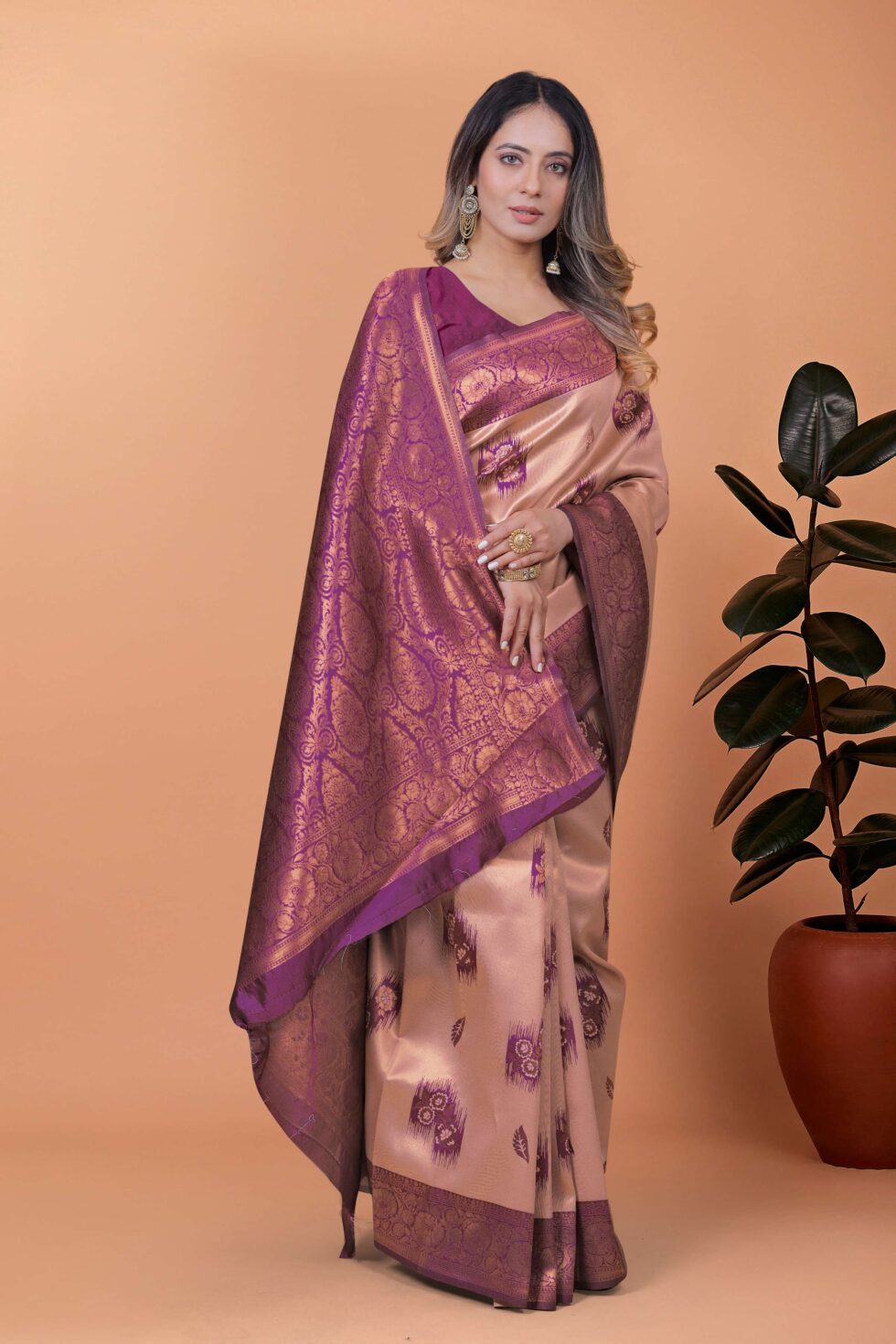 Step into sophistication with this Beige & Plum Zari Woven Banarasi Silk Saree, a perfect blend of traditional artistry and modern elegance. The soft beige silk body is adorned with delicate plum zari floral motifs, creating a subtle yet regal look.