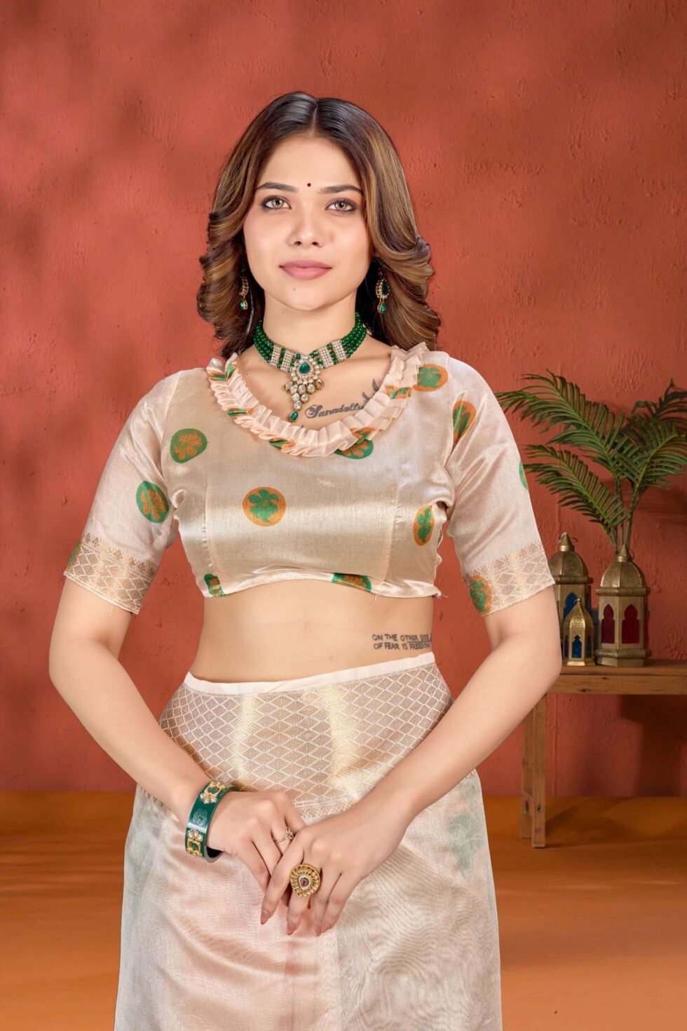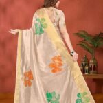 Grace your festive look with this elegant beige soft silk saree, beautifully highlighted with vibrant green and orange floral motifs. The minimal yet bold floral prints give it a refreshing and contemporary appeal.