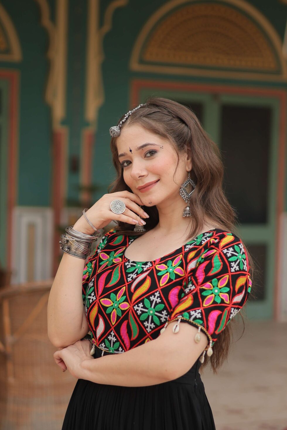 Step into the festive spirit with this premium Reyon gown, designed to bring together elegance and tradition. The gown is adorned with intricate Kutchi Gamthi Kodi work, adding a touch of cultural artistry. Its 3-layer gathering stitch enhances the volume and flow, creating a stunning 10-meter flair that makes every twirl unforgettable.