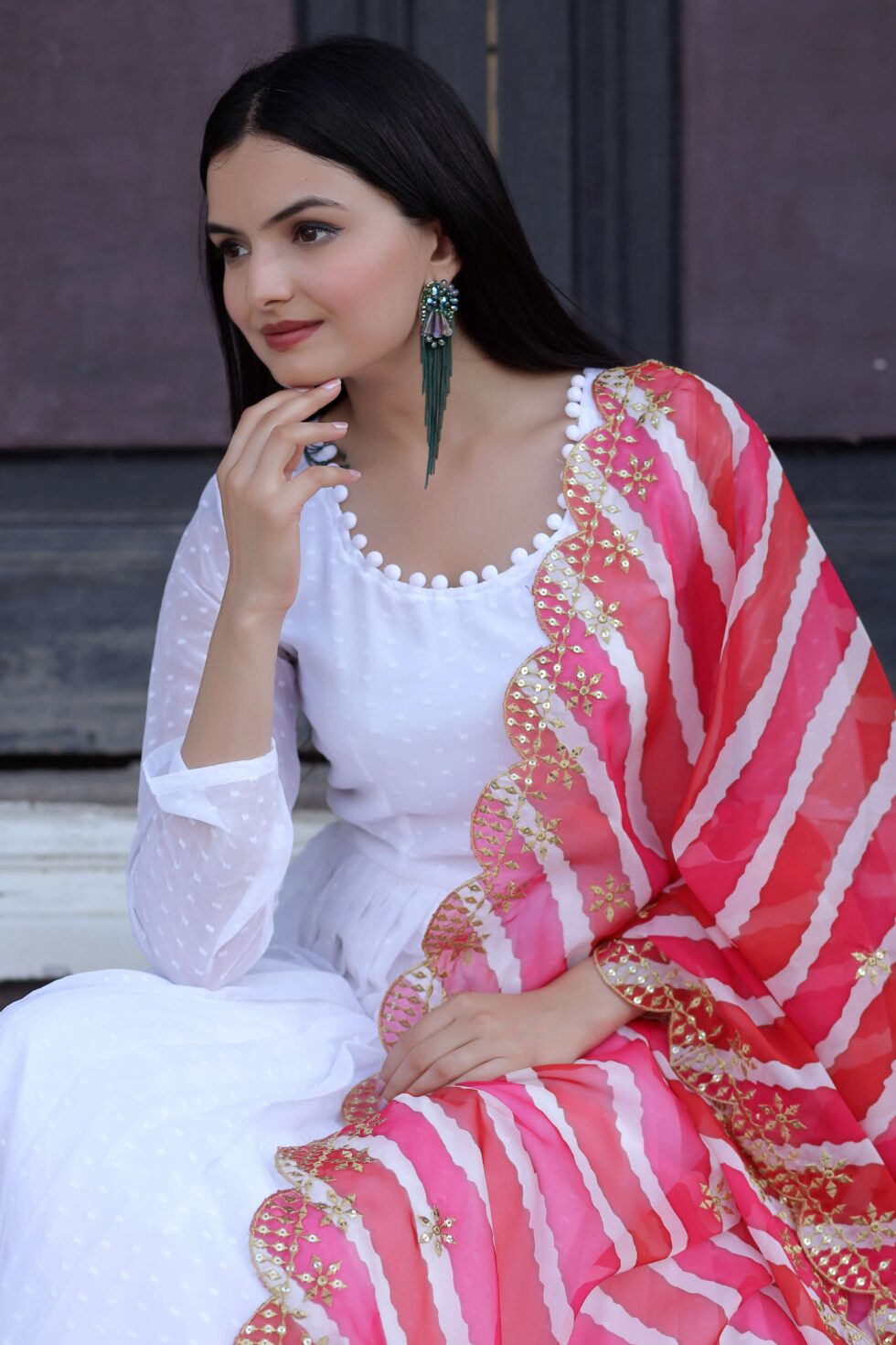 The set is complemented by a soft organza dupatta, beautifully detailed with Kalamkari digital print, Leheriya-inspired design, and fine embroidery cutwork for a sophisticated finish. Perfectly blending modern elegance with traditional charm, this gown-dupatta set is ideal for weddings, festive events, cultural functions, and special gatherings.
