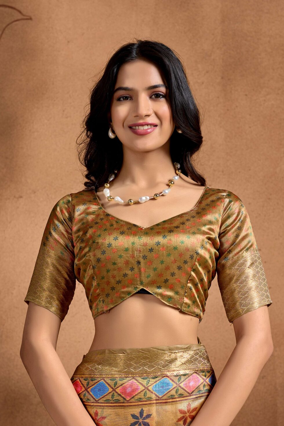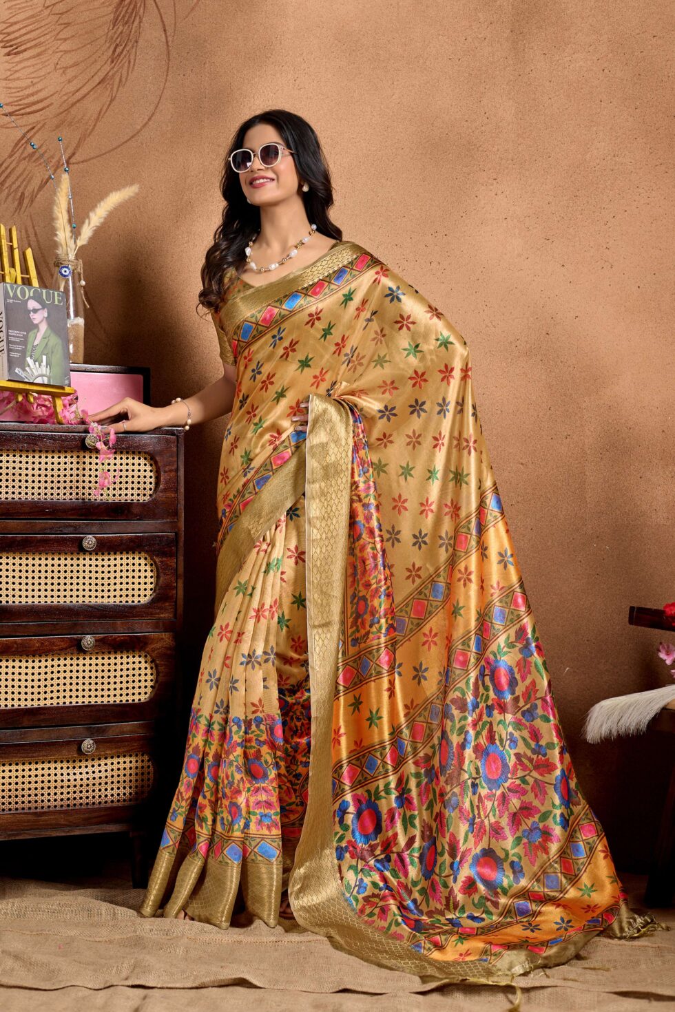 An exquisite blend of elegance and vibrance, this golden soft silk blend saree is adorned with intricate multicolor floral and star motifs. The rich design features a striking contrast pallu with bold floral patterns and geometric detailing, making it a perfect choice for festive and traditional celebrations.