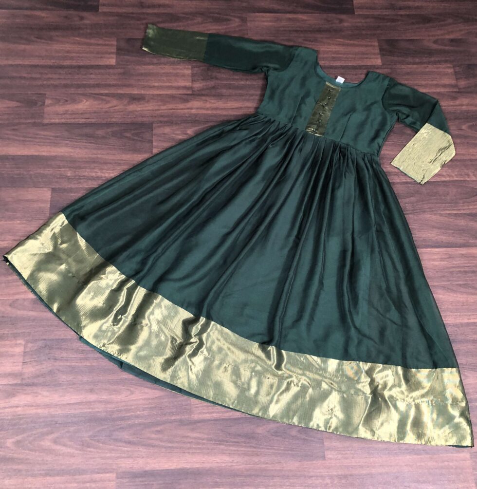 Make a graceful statement with this premium chiffon gown featuring intricate golden zari patta weaving. Designed with full sleeves, a designer round neck, and a flowing 3.5-meter flare, this gown offers elegance and comfort for festive occasions, parties, and celebrations.