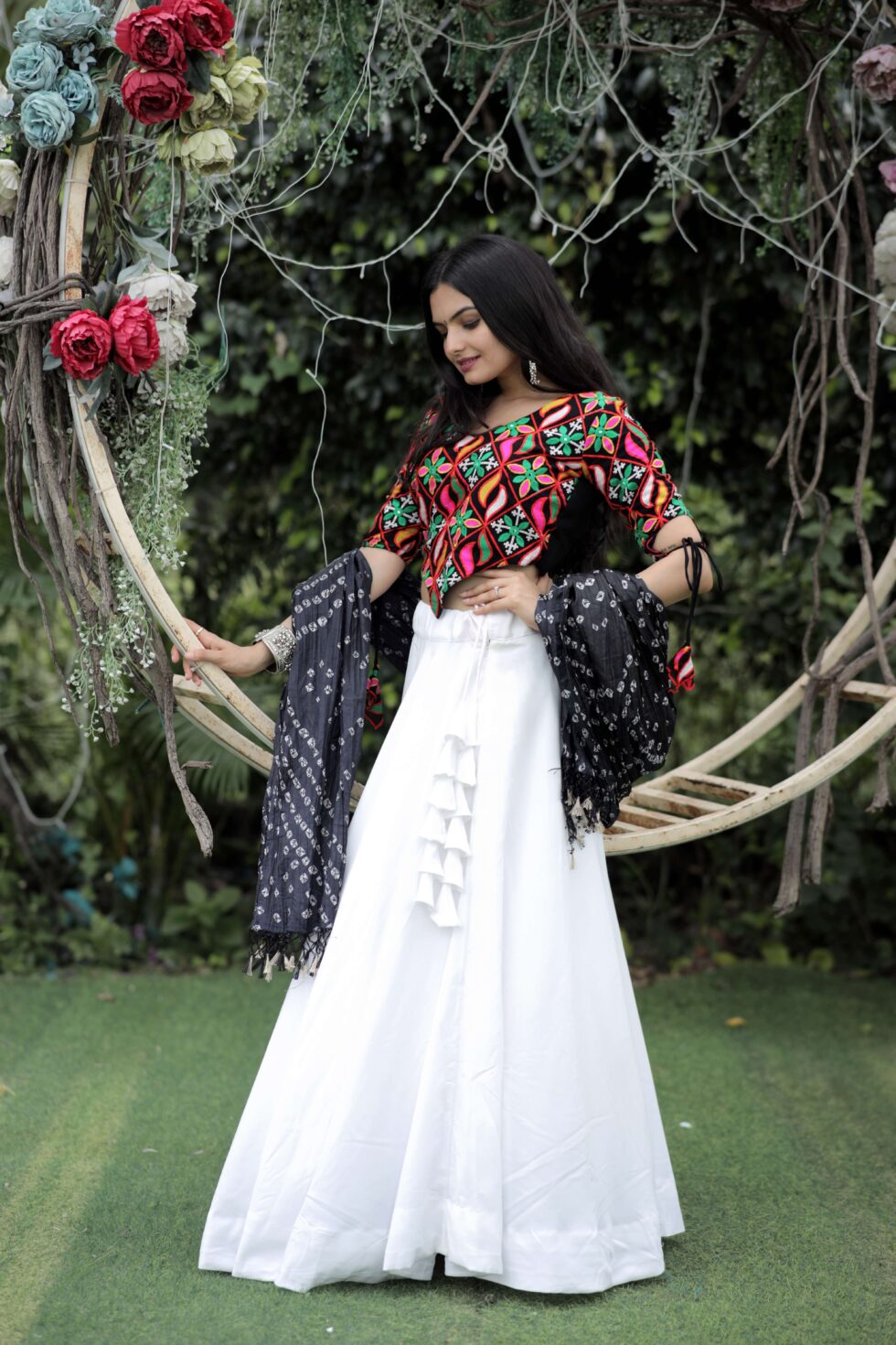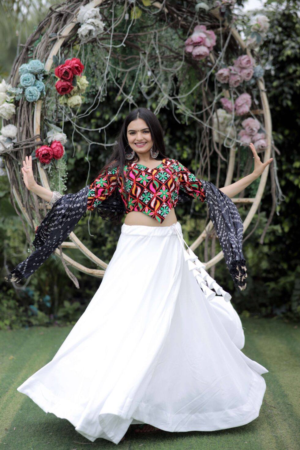 Festive-ready frolic cotton lehenga with umbrella flair, embroidered faux georgette blouse, and bandhej printed chinnon dupatta. A perfect pick for Navratri and traditional occasions.