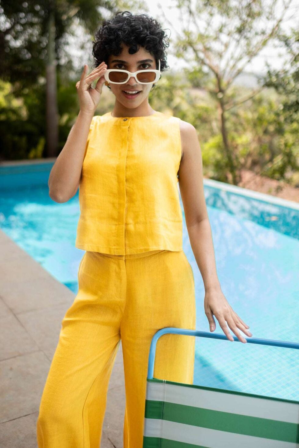 Women’s Cotton Solid V Neck Sleeveless 2 Piece Outfit Loose Tank Top and Wide Leg Palazzo Pants Sets cord set ( Golden )