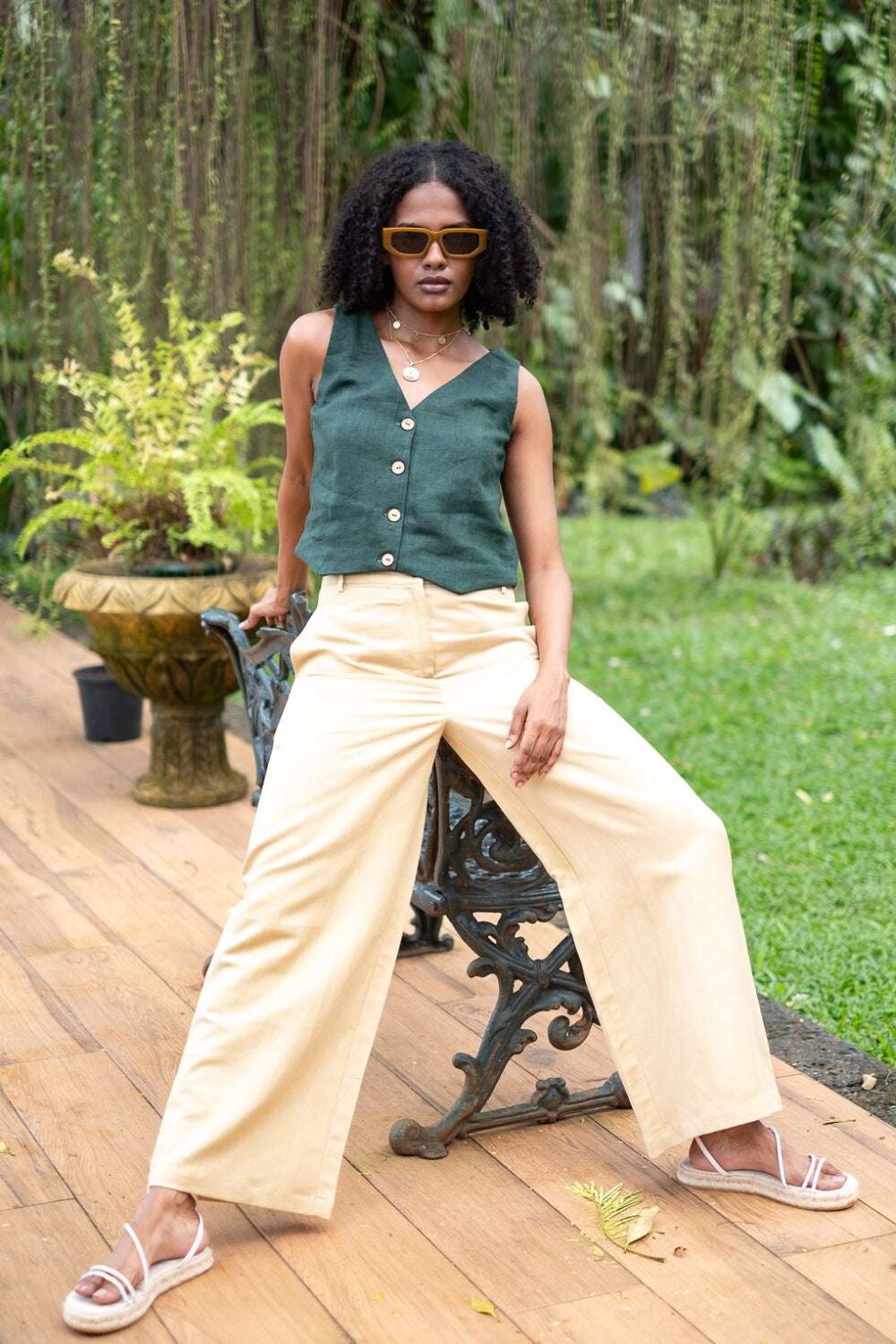 Women’s Cotton Solid V Neck Sleeveless 2 Piece Outfit Loose Tank Top and Wide Leg Palazzo Pants Sets cord set ( Green )