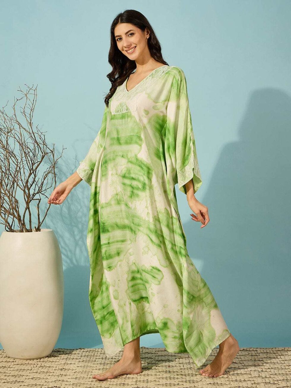 Women’s Cotton Tie Dye Print Flowing Bell Sleeves Full Length Kaftan Drees Casual Beach Wear ( Green )