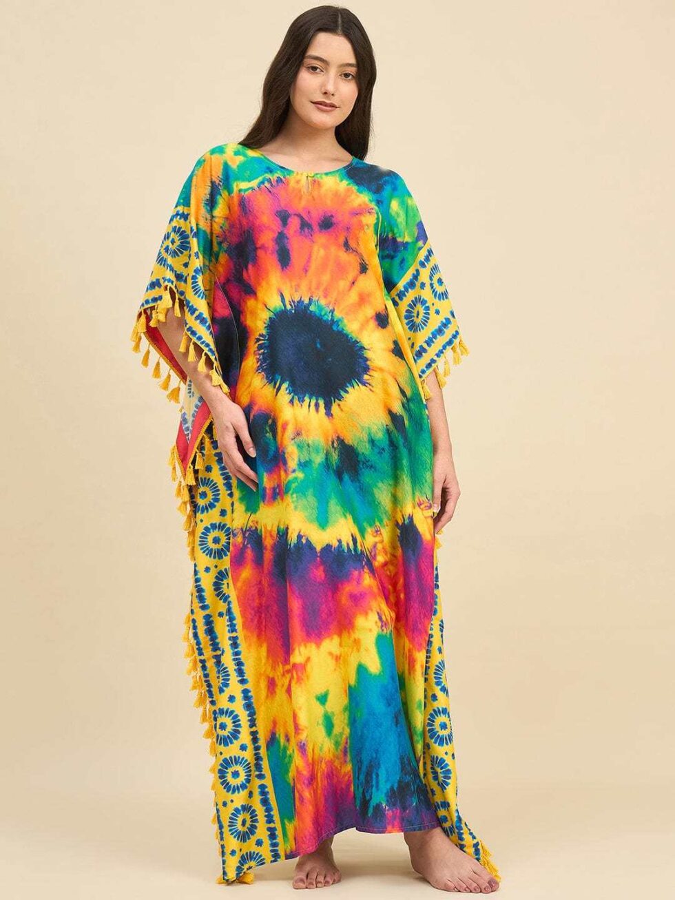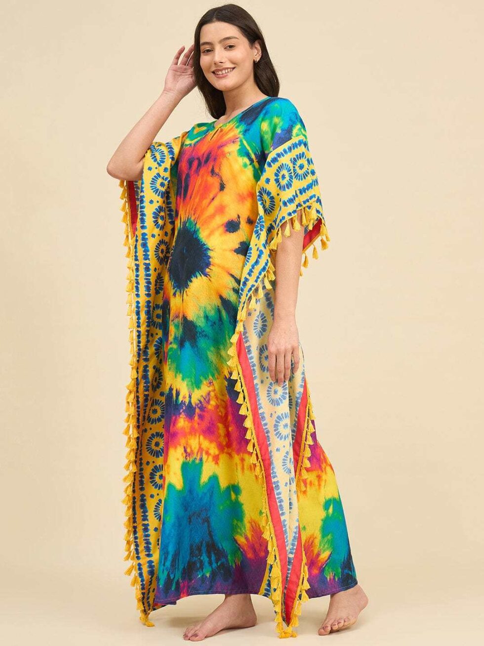 Women’s Cotton Tie Dye Print Flowing Bell Sleeves Full Length Kaftan Drees Casual Beach Wear ( Multicolor )