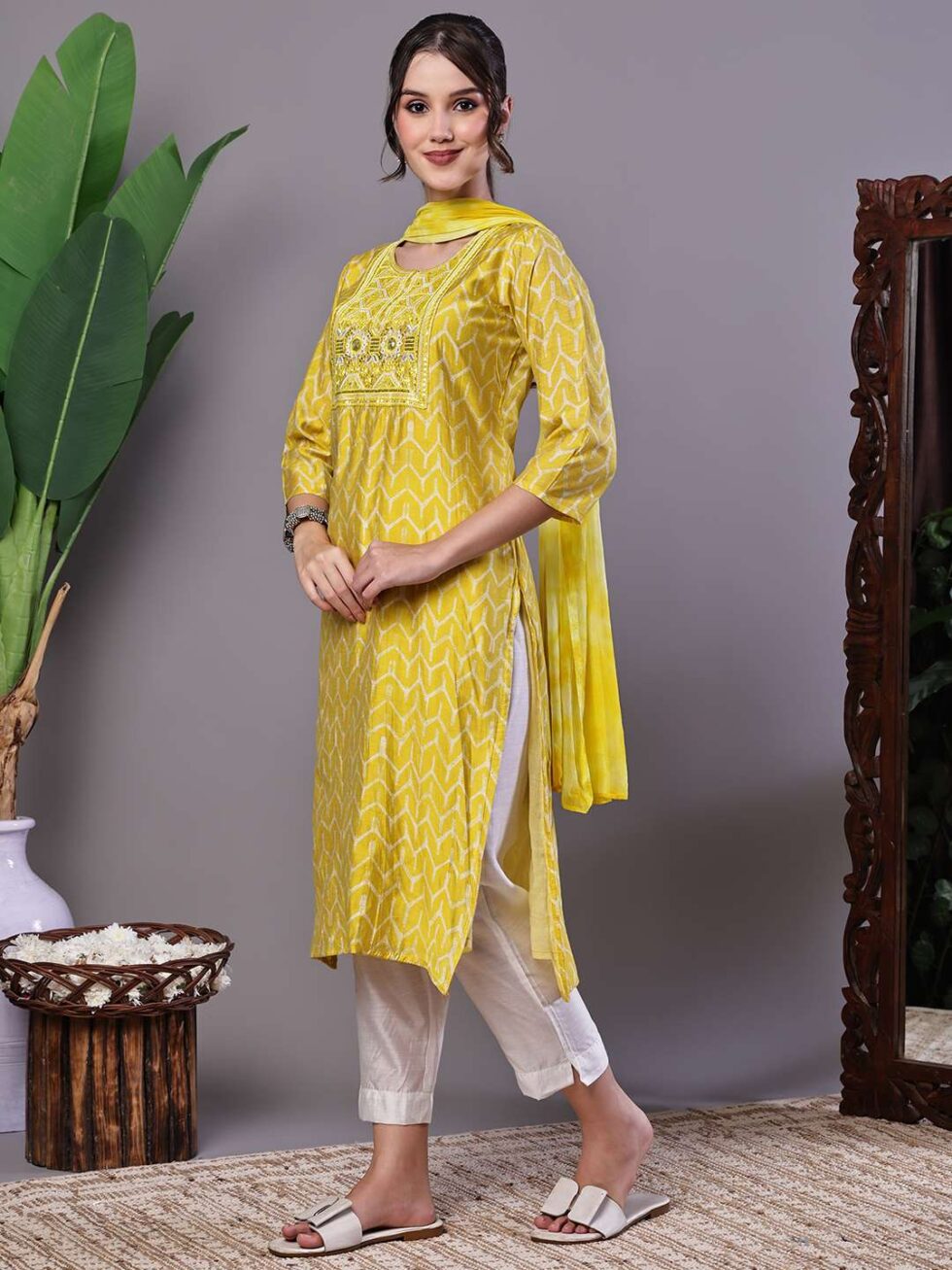 This ensemble is an elegant and vibrant ethnic kurta set, ideal for celebrating festive occasions or for smart casual wear. The straight-cut kurta features an eye-catching, all-over print, beautifully contrasted by a detailed square neckline. This neckline is the focal point, adorned with intricate sequin and zari embroidery that lends a touch of traditional glamour. Paired with crisp, solid white trousers and a coordinating dupatta, the outfit offers a complete, polished look with a comfortable, flattering A-line silhouette and classic 3/4 sleeves. This set perfectly balances traditional artistry with modern wearability.